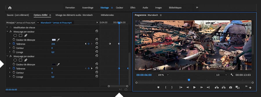 Créez une transition entre deux scènes en les fusionnant progressivement avec l’effet Masquage par couleur d’Adobe Premiere Pro.