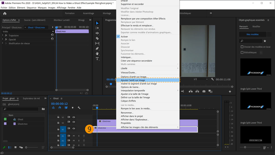 9. Pour créer une image fixe de la scène, faites un clic droit ou cliquez en maintenant la touche Ctrl enfoncée sur le plan en V1 et sélectionnez Ajouter l’arrêt sur image. Dans le panneau Montage, la vidéo en V1 montre alors une image figée de la position de la tête de lecture tout au long du plan.