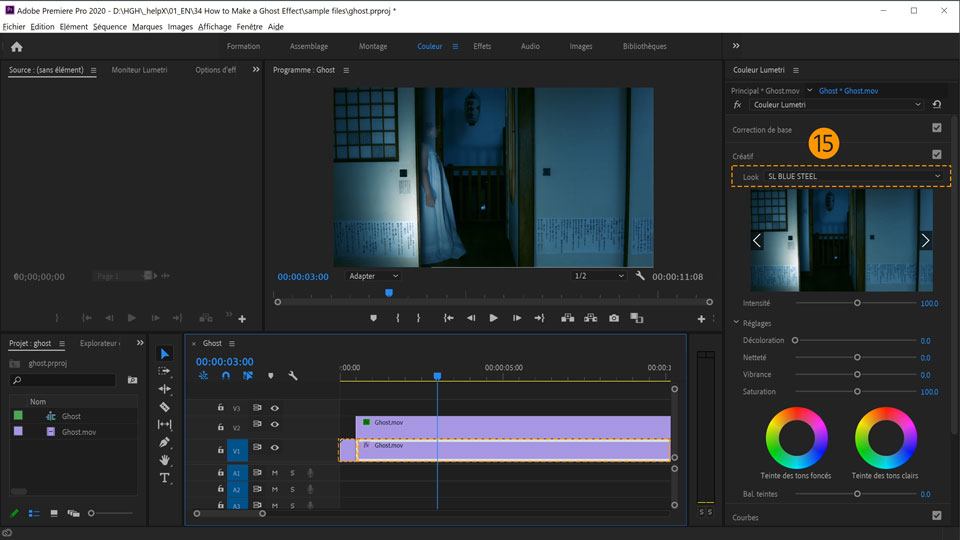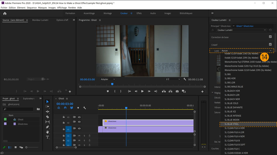 14. Assurez-vous que le plan en V2 est sélectionné. Dans la section Créatif du panneau Couleur Lumetri, ouvrez le menu déroulant Look et choisissez SF Blue STEEL.