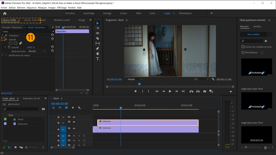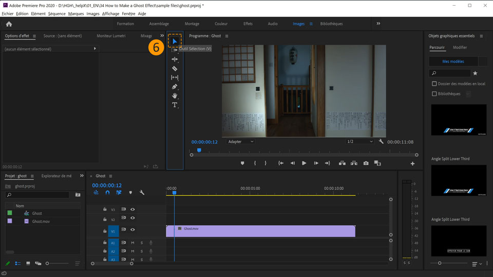2. Faites glisser la vidéo ghost.mov du panneau Projet vers le panneau Montage . Premiere Pro crée automatiquement une séquence ayant le nom de la vidéo et ajoute le plan à la première piste V1.