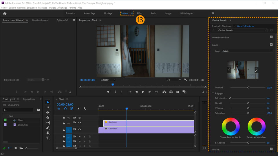 4. Dans le panneau Montage, placez la tête de lecture juste avant l’apparition de la fille dans la scène (aux alentours de 00:00:00:13).