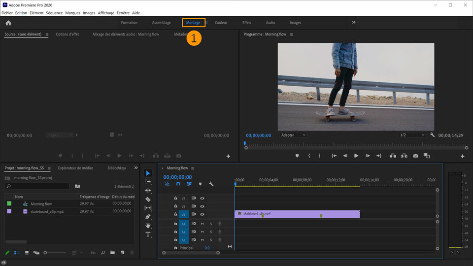 1. Téléchargez lesfichiers d’exemple et ouvrez « clips-social-media.prproj » dans Premiere Pro. Assurez-vous que l’espace de travail Montage est sélectionné dans le menu supérieur.