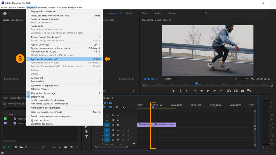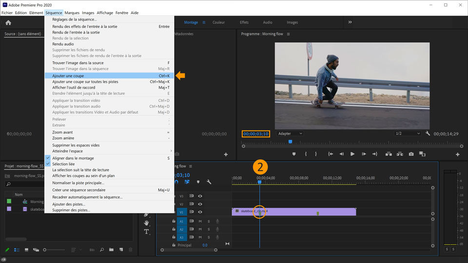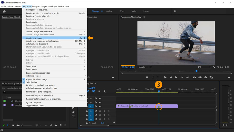 2. Raccourcissez d’abord la séquence. Placez la tête de lecture à 00:03:10 dans le montage et cliquez sur Séquence > Ajouter une coup e pour couper la séquence Skateboard. Vous pouvez également utiliser les raccourcis Ctrl + K (Windows) ou Cmd + K (macOS).
