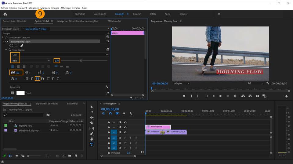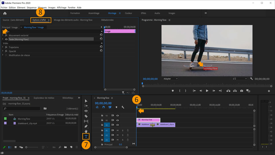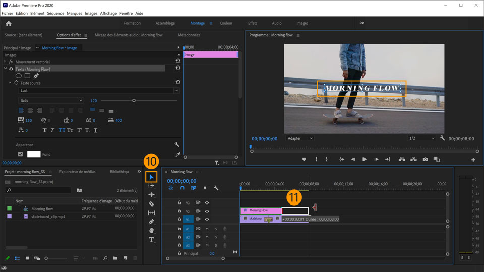 7. Sélectionnez l’outil Texte (T) dans la barre d'outils, puis, dans le panneau Programm e, cliquez à l'intérieur de la fenêtre d’aperçu de la vidéo et saisissez « Morning Flow ».
