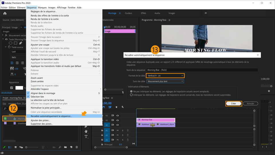 13. Dans la fenêtre Recadrer automatiquement la séquence qui s’affiche, définissez le format de la cible sur Vertical 9:16 pour une publication sur Instagram. Dans le menu déroulant Suivi de mouvement, sélectionnez l’option Mouvement plus lent pour une meilleure correspondance avec le mouvement dans la vidéo. Cliquez ensuite sur Créer.