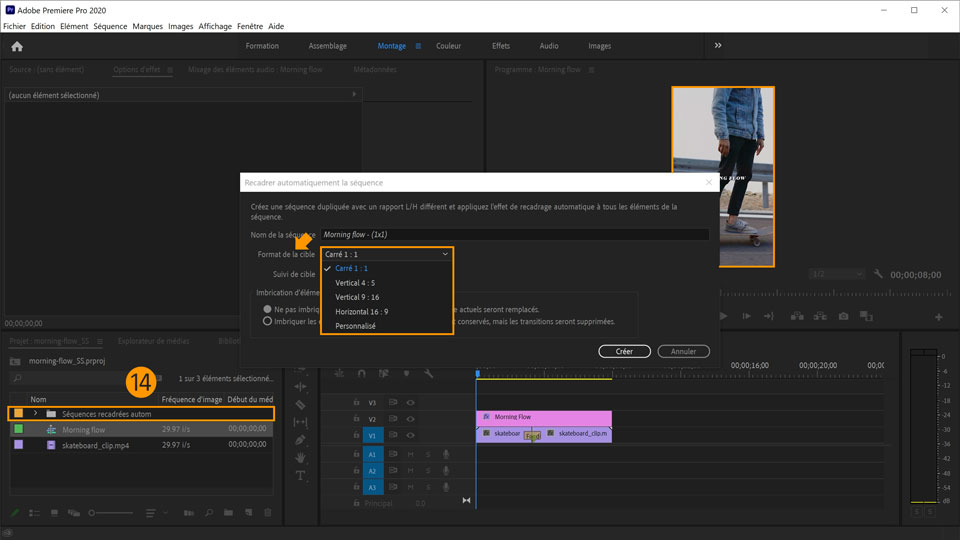 Conseil : utilisez la fonctionnalité Recadrer automatiquement la séquence sur la vidéo montée afin de décliner la séquence pour d’autres réseaux sociaux à l’aide des autres options Format de la cible.
