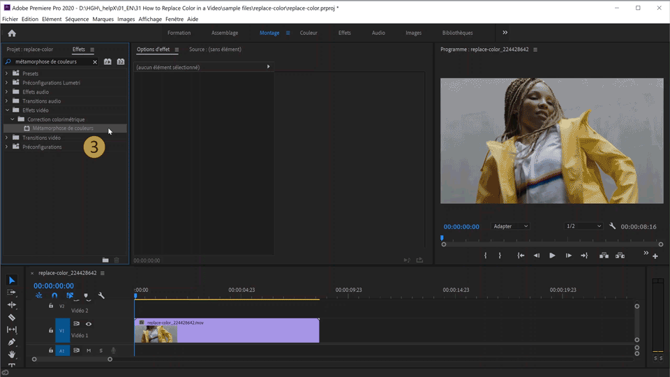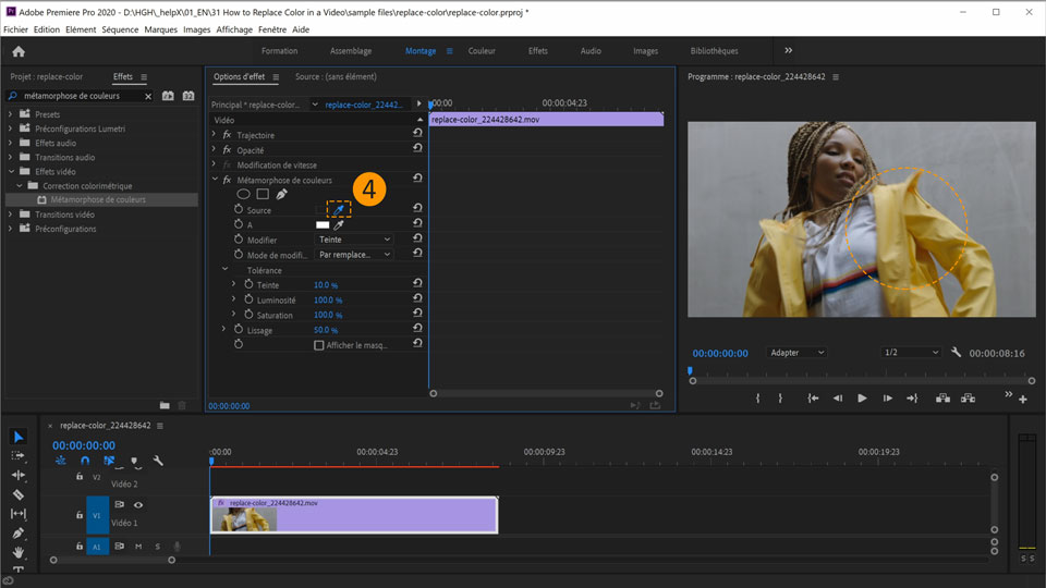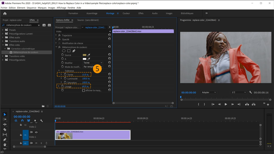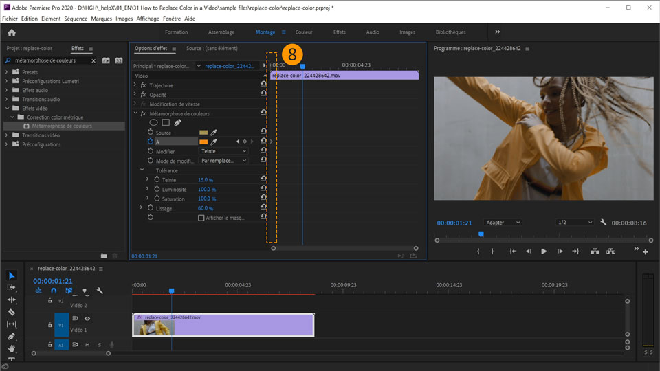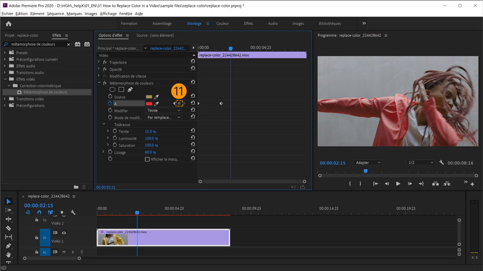 12. Avancez la tête de lecture jusqu’à la position suivante de la vidéo et appliquez une couleur violette à la veste en changeant la valeur chromatique dans la section À des paramètres d’effet Métamorphose de couleurs. Une image clé est automatiquement créée. Faites glisser la tête de lecture pour prévisualiser les changements de couleur créés jusqu’à présent.
