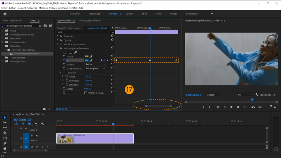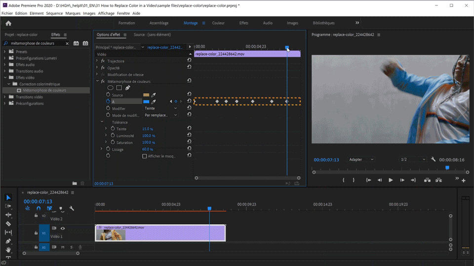 14. Avancez de nouveau la tête de lecture et appliquez une couleur bleue à la veste en changeant la valeur chromatique dans la section À des paramètres d’effet Métamorphose de couleurs.