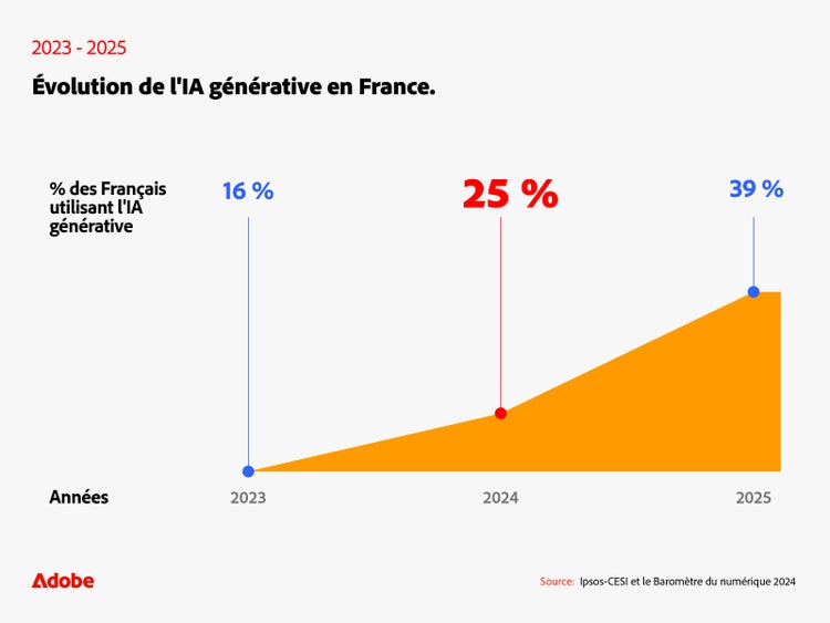 - 39 % des Français utilisent l'IA générative (+143 % vs 2023) (Baromètre du Numérique, 2024)