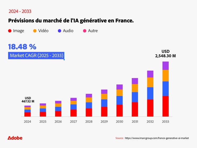 - Le marché français de l'IA générative passera de 557M$ (2024) à 2,5 Mds$ (2033) (IMARC Group)