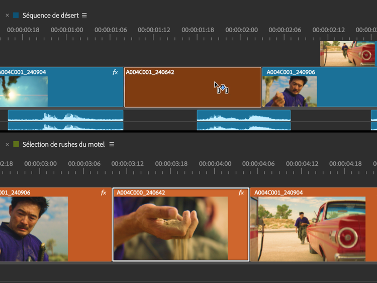 Ajoutez un plan à la séquence pour couper la vidéo à l’aide des outils de référence de Premiere. Avec l’outil Sélection, cliquez sur le bord et faites-le glisser pour couper la vidéo. Pour les raccords plus complexes, vous pouvez utiliser d’autres outils de montage, comme Ondulation, Déroulement à la verticale, Déplacer dessous et Déplacer dessus.