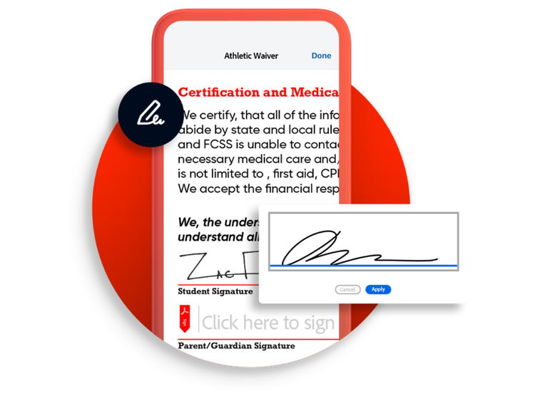 Καταγράψτε με ασφάλεια ηλεκτρονικές υπογραφές για σημαντικά έγγραφα, όπως τα εξατομικευμένα προγράμματα εκπαίδευσης και τα συμβόλαια των προμηθευτών, ενώ παράλληλα τηρείτε τη συμμόρφωση. Η Adobe, ο αξιόπιστος ηγέτης στις ασφαλείς εμπειρίες ψηφιακών εγγράφων, διασφαλίζει ότι πληροίτε τις απαιτήσεις των FERPA, COPPA, HIPPA, CFR Part 11 και άλλων.