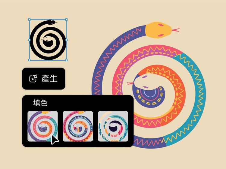 透過「Generative Shape Fill」功能,利用符合您藝術作品外觀的豐富細節和顏色,快速填滿簡潔的向量線稿。