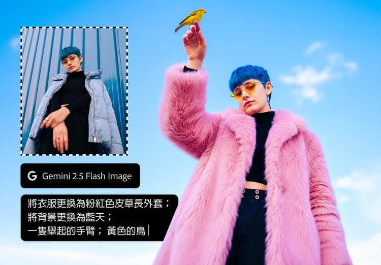 「生成式填色」現在可以使用 Gemini 2.5 Flash Image (Nano Banana) 和 FLUX.1 Kontext [pro],以及全新的 Firefly 填色和擴張模型 (Beta) 來獲得更多選擇和更好的成果。使用簡單的提示和非破壞性工具來進行精確的編輯。