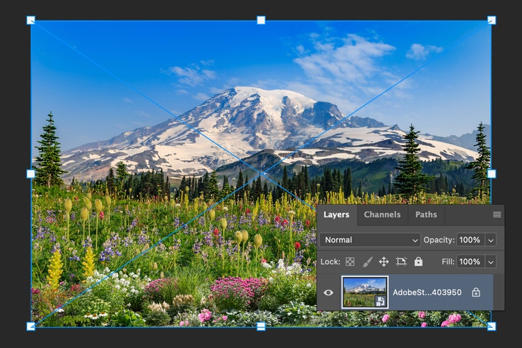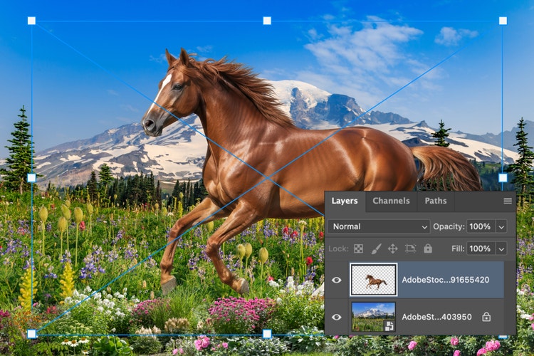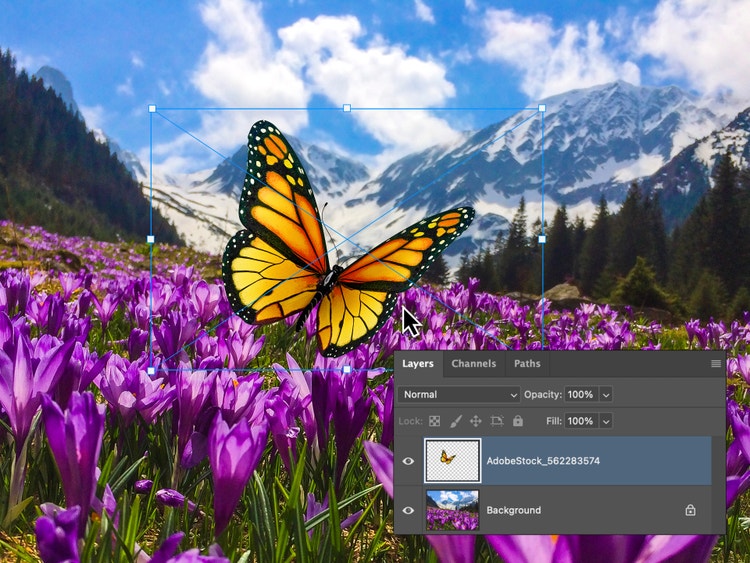 若要將影像加到影像上,請將第二個檔案拖放到您的 Photoshop Workspace 中。它會自動顯示為新圖層。視需要調整大小和重新定位,以創造您想要的外觀。