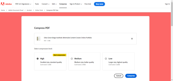 Step 3: After selecting the PDF, choose the compression level you want from the options provided, such as High, Medium, or Low.