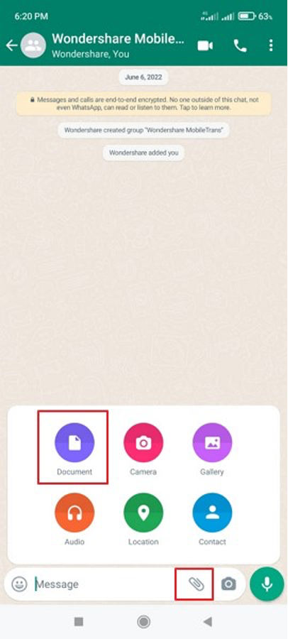 Step 2: Tap the Attachment button, which is usually represented as a paperclip icon. This will pop up a menu. Choose the “Document” or “File” option from there. This will further open another window that will prompt you to select a PDF document from the device storage.