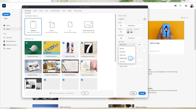 CMYK is a colour mode that is the industry standard for full colour image printing. The letters refer to the four inks used in the printing process - Cyan, Magenta, Yellow and Key (Black). CMYK files are offered in an array of file formats, PDFs being ideal. To set the colour mode to CMYK in Photoshop, go to Image > Mode and select CMYK or when you create a new document go to Colour Mode > CMYK Colour and then push Create.