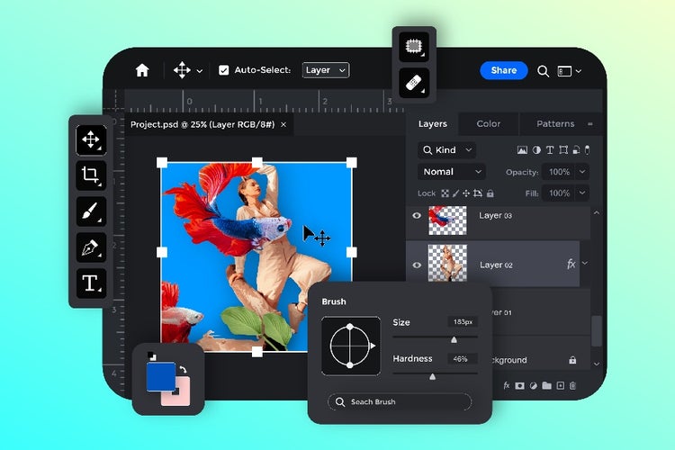 - Professional grade editing tools: Work with layers, masks, and smart objects for full control over every design element.