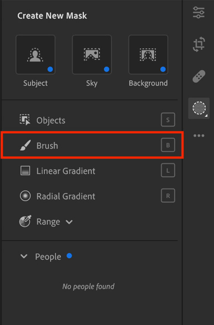Click the Brush tool or press B for the shortcut. Click and drag your mouse over the section you want to adjust. You will see a transparent red overlay showing the areas that will be affected. You can press [ or ] to decrease/increase the size of your brush. Hold down Alt (‘option’ on Mac) to toggle from the Brush to the Eraser (or select the Eraser at the top of the Brush options section) to subtract from your selection if you paint over something accidentally and want to remove it from the mask.