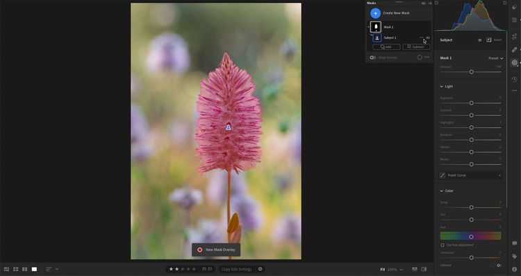 To give this second image a lighter and brighter feel and place more emphasis on the flower, choose “Subject” and Lightroom will automatically select the flower. The masked area will be highlighted in a red overlay. We can use the Light panel to increase the Exposure and the Highlights and the Colour panel to increase saturation.