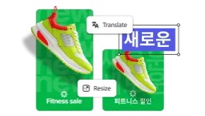 Resize assets for different channels in a click and translate text in seconds. Quickly insert or remove objects and make backgrounds disappear.¹