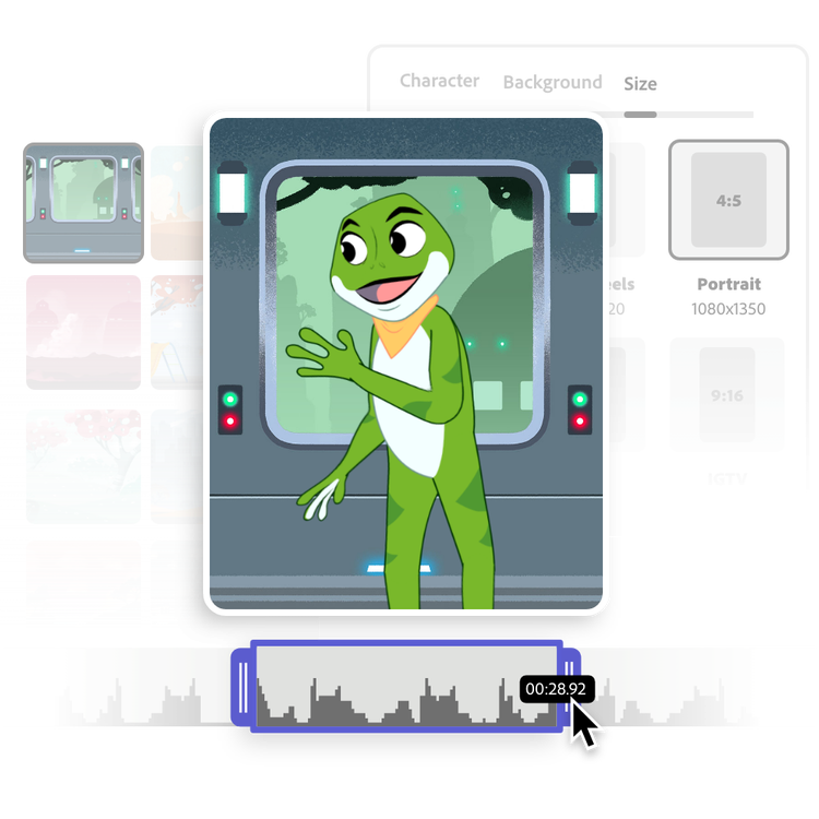 Bring your character to life when you upload your own audio files or record a voiceover of up to two minutes long in the online animation tool. Pause at any time and resume when you’re ready. Select Done to process your audio and generate your animation. Preview your avatar with newly added audio and watch how each Adobe Express character’s eyes and hand gestures move naturally with the tone of your voice for an engaging viewing experience.