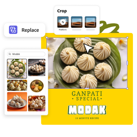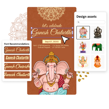 A banner is a versatile piece of decor that can be used year after year. Make a small one as a puja background or a larger one for a community pandal. When editing a Ganesh Chaturthi banner, the background sets the tone for the piece. So, start your banner design by thinking about the background and the items that will be placed in front. Go for a bright festival colour and search the Adobe Express library for Vinayaka-related motifs and place these around the edges. Embellish the design with gold accents and you're ready to send it to print.