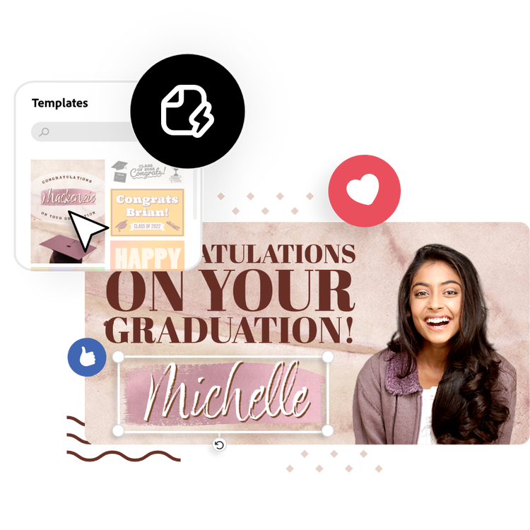 Hone your creativity with the power of Adobe Express. Explore professionally designed templates to get your wheels spinning or create your graduation banner from scratch. Establish a theme for your designs using photos, icons, logos, personalized fonts, and other customizable elements to make them feel entirely authentic. Duplicate designs and resize them to create consistency across multiple types of assets. With Adobe Express, it's free and easy to make, save, and share your designs within minutes.