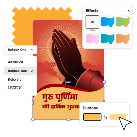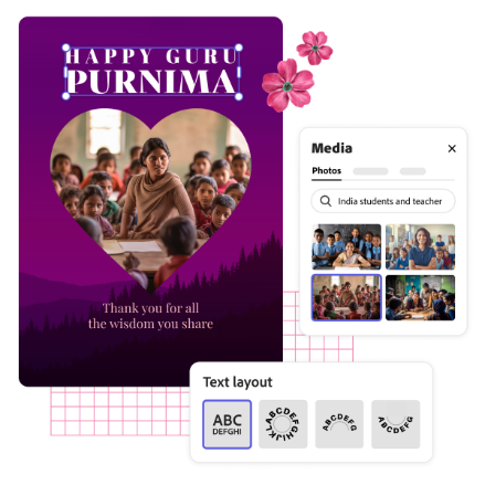 Creating a banner for Guru Purnima is simple with Adobe Express. The intuitive interface allows you to drag and drop whatever you like onto your design to wherever you need it to go, giving you complete control. To save even more time, our professionally designed templates are a great starting point. Whether you are adding a festive banner to your social media account or creating a promotion as a business, you can create something in a matter of minutes.