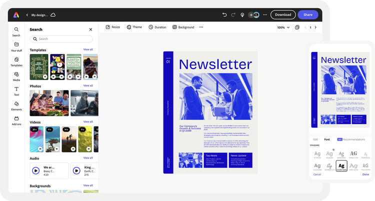Hone your creativity with the power of Adobe Express. Explore professionally designed templates to get your wheels spinning or create your booklet from scratch. Establish a theme for your designs using photos, icons, logos, personalized fonts, and other customizable elements to make them feel entirely authentic. With Adobe Express, it's free and easy to make, save, and share your designs within minutes.
