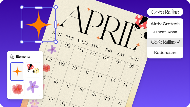 With our easy personalized calendar maker, you can combine any image with text and unique graphic elements or simply use a calendar template to get you started. Design a calendar for any month and year, then style it to match your project. Adobe Express makes it easy for both beginners and design pros to create the perfect calendar.