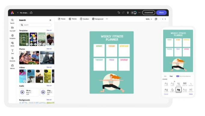 Hone your creativity with the power of Adobe Express. Explore professionally designed templates to get your wheels spinning or create your workout plan from scratch. Establish a theme for your designs using photos, icons, logos, personalized fonts, and other customizable elements to make them feel entirely authentic. Duplicate designs and resize them to create consistency across multiple types of assets.