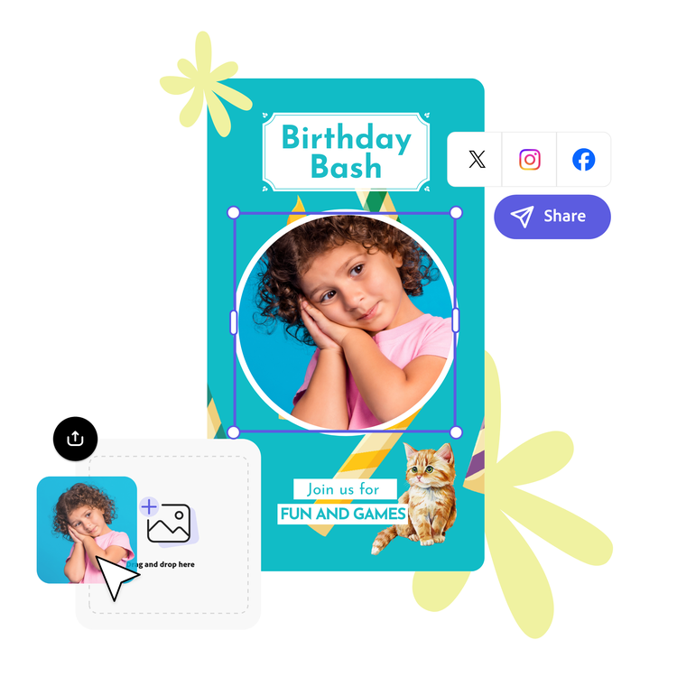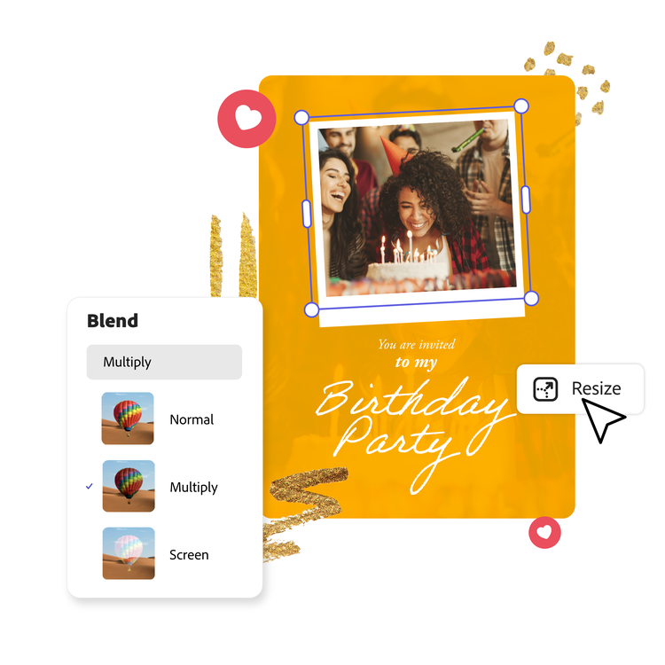 Explore professionally designed templates to get your wheels spinning or create your birthday card from scratch. Establish a theme for your designs using photos, icons, logos, personalized fonts, and other customizable elements to make them feel entirely authentic. With Adobe Express, it’s free and easy to make, save, and share your designs within minutes.