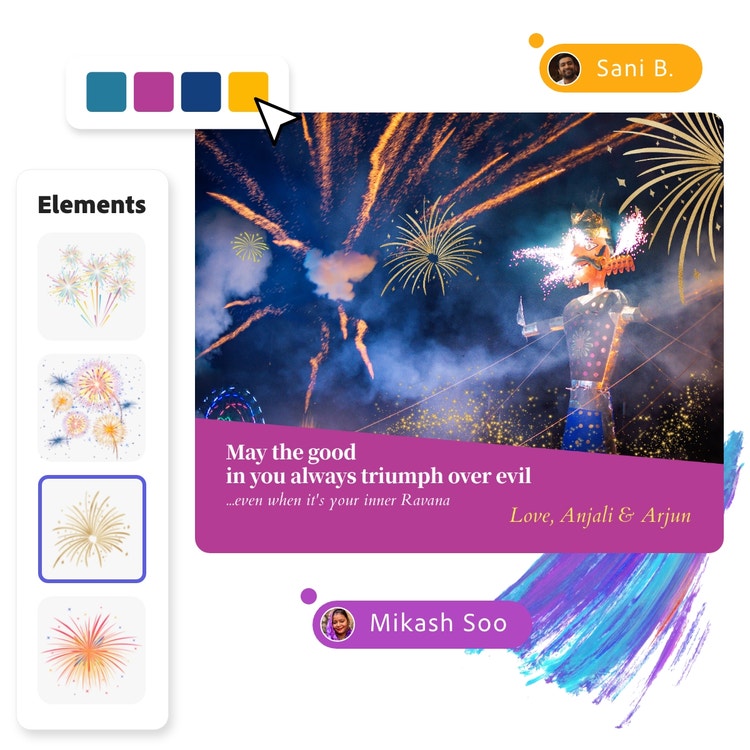 Dussehra card making is fabulous fun for the family – especially when Adobe Express lets you share ideas and designs, making it a truly collaborative activity. Start by looking for images that show how goodness triumphs over evil. Goddess Durga is an inspiring example for young people, and the victory of Lord Rama over Ravana is a timeless tale that resonates with every generation. Next, let the children record Dussehra greetings using the microphone on your device (you can do this in the app) and create a digital card that speaks to the recipient. Imagine the delight when your family and friends receive this personal greeting.