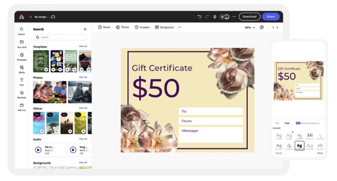 Beautiful, versatile gift certificates. Adobe Express can help you with that.