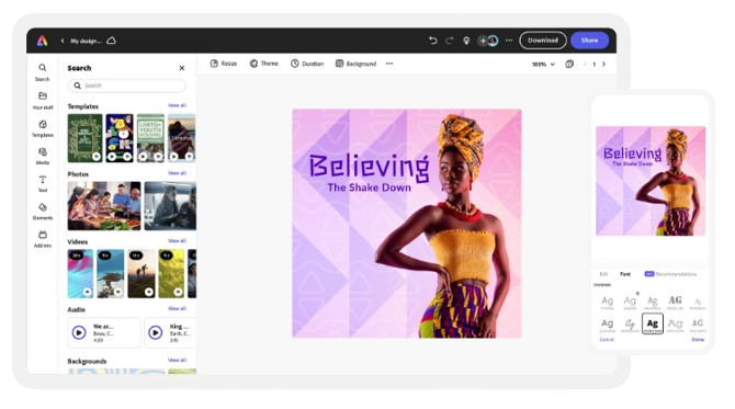 Enjoy making cover artwork for just about anything, from burned CDs to podcasts to motion picture soundtracks and everything in between. Use your artwork for both printed covers as well as digital ones. Turn your album artwork into merch by remixing your design for t-shirts, posters, keychains, custom mugs or tote bags, and so much more, all right within your Adobe Express workspace.