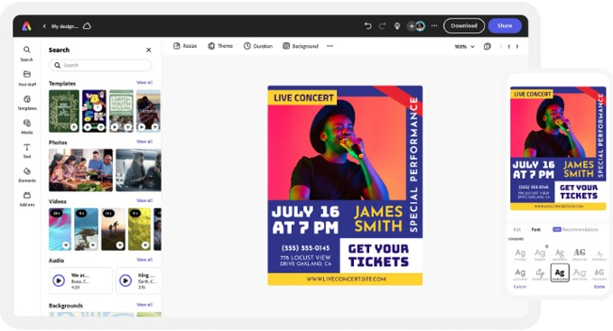 Adobe Express is a free, Cloud-based service. Cut down the costs involved in putting on your event by using the platform instead of hiring professionals. Wherever you are, and whatever you’re doing, you can log in to your account and fine-tune the design of your event flyers. Use Adobe Express to craft eye-catching event flyers that grab the attention of your target audience. The platform is free, easy to use, and lots of fun.