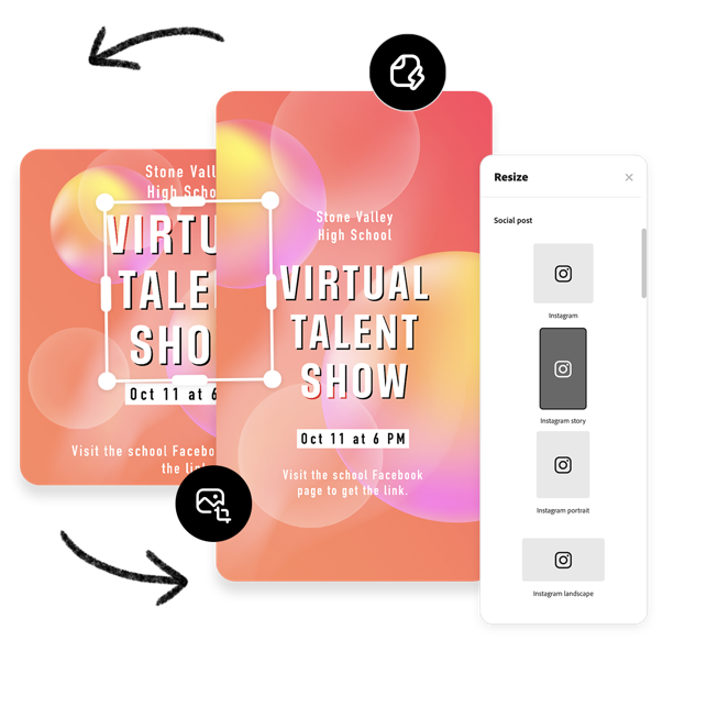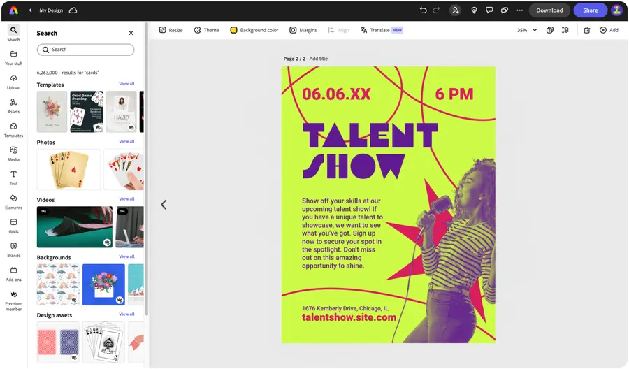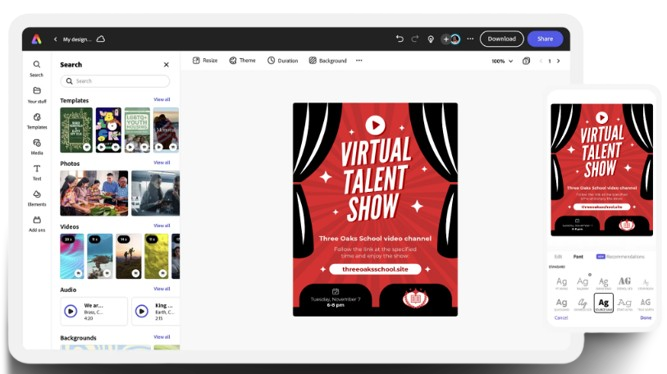 Explore professionally designed templates to get your wheels spinning, or create your talent show flyer from scratch. Establish a theme for your designs using photos, icons, logos, personalized fonts, and other customizable elements to make them feel entirely authentic to your school. With Adobe Express, it's free and easy to make, save, and share your designs within minutes.