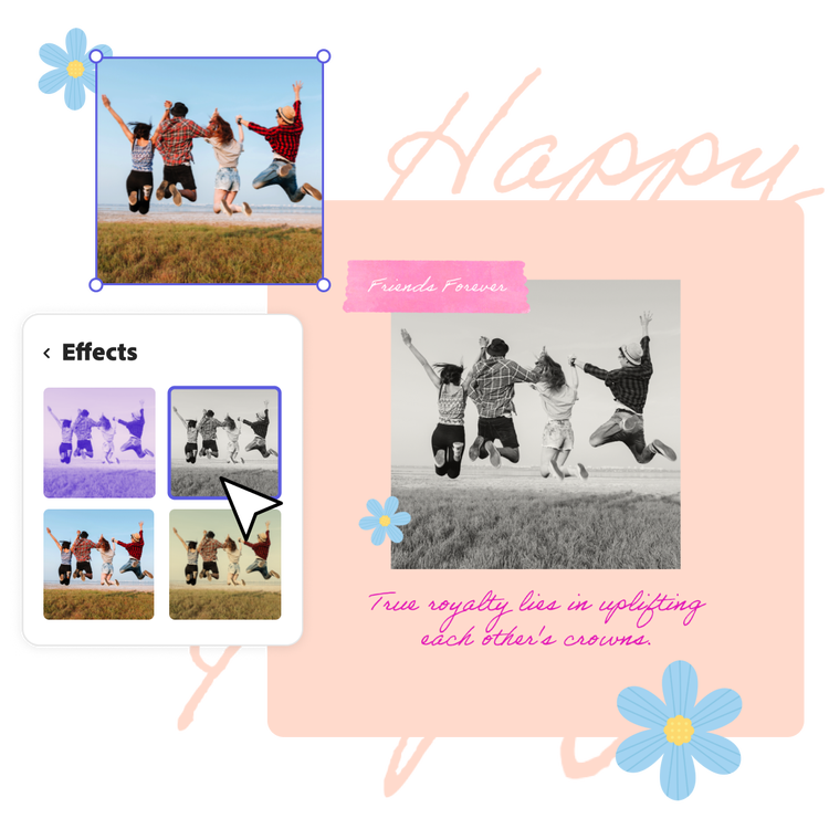 Whether you're sending your Friendship Day party invitation card to one friend or a group of special people, it's always a good idea to include custom photos of your cherished memories to add a personal touch. Choose from the wide range of card templates in Adobe Express and simply upload your photos. Using Adobe Express, you can edit your images even further, with options to crop and resize your image and apply filters, such as a black and white overlay. With Adobe Express, you'll be sending Friendship Day party invitation cards in no time.