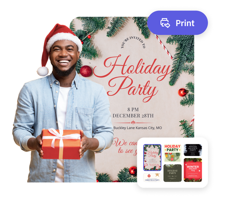Download your party invitations as a PDF, JPG, or PNG file to share anywhere. If you’re creating your card using the US, UK, Australia or Canada desktop version of Adobe Express, you can order high-quality prints in the full online editor and get it delivered to your door.