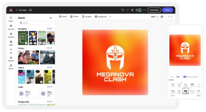 Further personalize your esports logo in the Adobe Express online editor. Select from dozens of animation styles to apply to the text or images in your esports logo. Then, download your animated logo as an MP4 file to share in video intros, social media clips, and even on your blog or website.