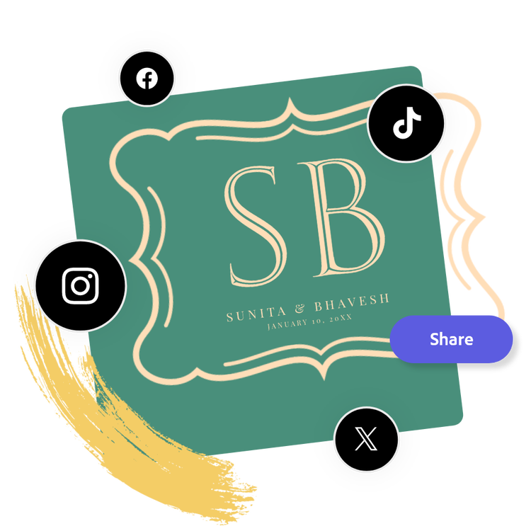 Your monogram should be a reflection of your brand or personality. Include your brand’s font style, color schemes, and image assets to complement your monogram if you have any. With a premium plan, you can apply all your brand assets in one-click. Adobe Express gives you all the tools you need to add a unique and memorable touch.Save and share your personalized monogram.