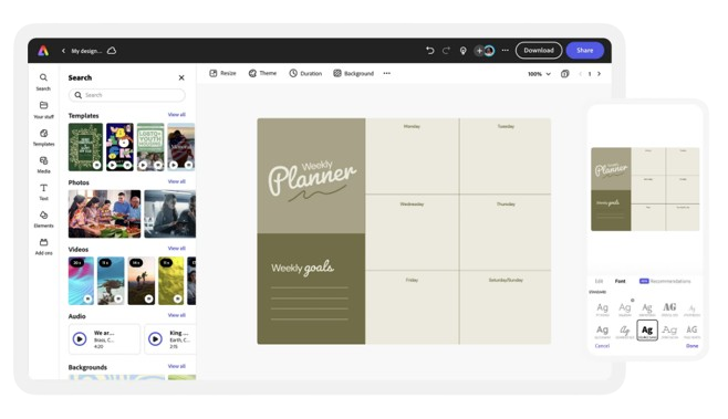 Plan day-to-day or years in advance, and everything in between with this free planner design tool. Choose from templates to personalize based on your needs or design your own planner from the ground up. Lay it out as a grid to make information easy to digest. Adobe Express is available on web and mobile, so you can update your planner anytime, anywhere.