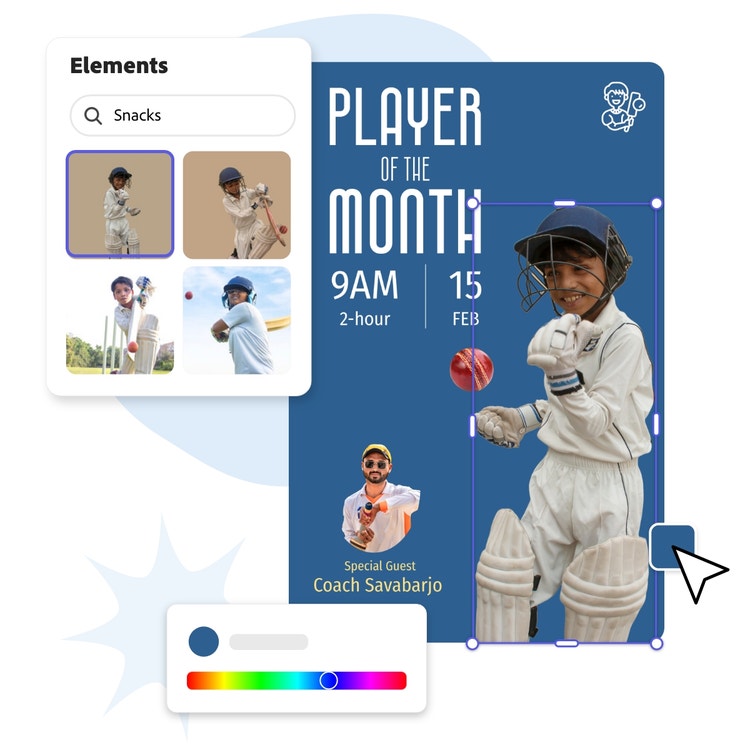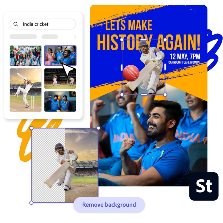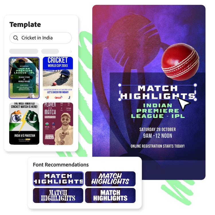 Make posters to show your support for the world's greatest game quickly and easily with Adobe Express. Get ready for the season and use our free illustrations and photos to create amazing cricket club posters and promotional posters for local cricket tournaments.