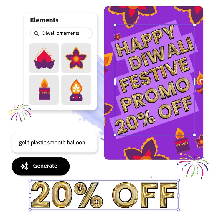 Posters displayed around your shop and on the window are great ways to encourage shoppers looking for gold items, sweets, or new fashion for Diwali rituals and celebrations. To attract attention with Happy Diwali wishes, try using the Generate Text Effect tool in Adobe Express. Start with a dark violet background and add a single Diwali diya or hanging sky lantern with fireworks, leaving plenty of space for a heartfelt message. Look through the design assets for ideas such as flowers or lights and combine a couple in your poster to make them your own. You’ll have no trouble attracting attention with a little help from Adobe Express.
