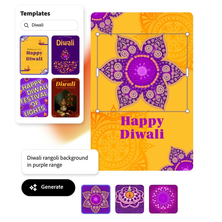 A festival poster is the perfect way to promote and celebrate good wishes during Diwali. Whatever ideas you have for your festival of lights poster, Adobe Express helps you bring your vision to life with ready-made templates and high-quality Adobe Stock images you can use to customize your very own. No experience required.