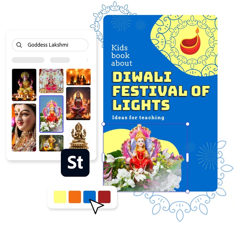Help children learn about the traditions and practices around Diwali by making colourful wall posters for the classroom or home. Help young minds understand why we make elaborate Indian rangoli patterns, light diya oil lamps, and explain the reasons behind exchanging gifts. Start with a colourful poster template and search for light festival illustrations to drag and drop onto your poster. Teach children early about Goddess Lakshmi and the meaning of prosperity or make a quiz with Diwali-themed folklore. With Adobe Express, it's easy to introduce a little festive magic into the classroom.