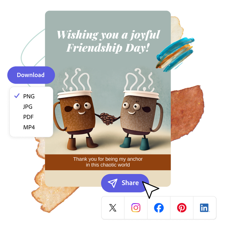 Share your message with the world with a stylish poster made in Adobe Express. Search for a starting point with our professionally made templates; there is guaranteed to be something that suits your taste. Then customise with heartwarming quotes about International Friendship Day, which you can pair with our high-quality stock imagery. There are heaps of fonts you can experiment with to get one that expresses the positive tone of this celebration. The use of bright colours and smiling friends is an easy way to show the beauty of friendship in your poster and create a treasured moment.