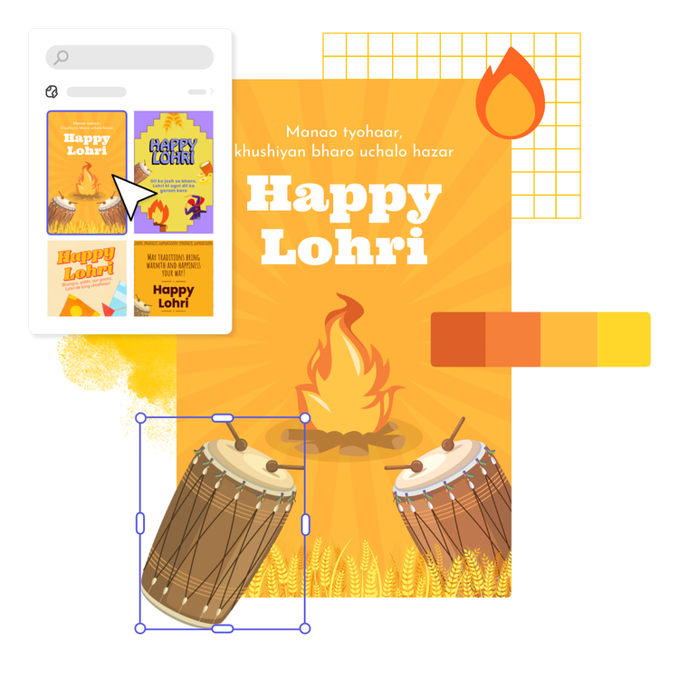 Get everyone in a happy mood and invite them to celebrate with you by hosting a dance party during the festival. Get the word out early by making an Instagram story poster for your socials. Start with a portrait style poster template (one that's longer than it is wide) to create the layout, and you'll be able to use the same design as a Lohri celebration Facebook or Instagram post to save time. Browse through the Adobe Express photos of a dhol or people dancing and use energetic colours when you add the details. When you're happy with the layout, save it as a template and use the same project for all your social posts. You'll find it's quick and easy to resize and fine-tune your poster design in Adobe Express.